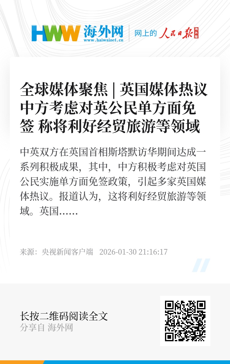 路透社刊文称,英方期待通过此项政策,加强双方经贸领域的合作,尤其是拓展服务业市场。文章援引英国首相斯塔默的话说,英国企业一直“迫切寻求拓展在华业务的途径”。他补充说,免签政策将有助于推动企业在华市场发展,进而促进英国就业增长。