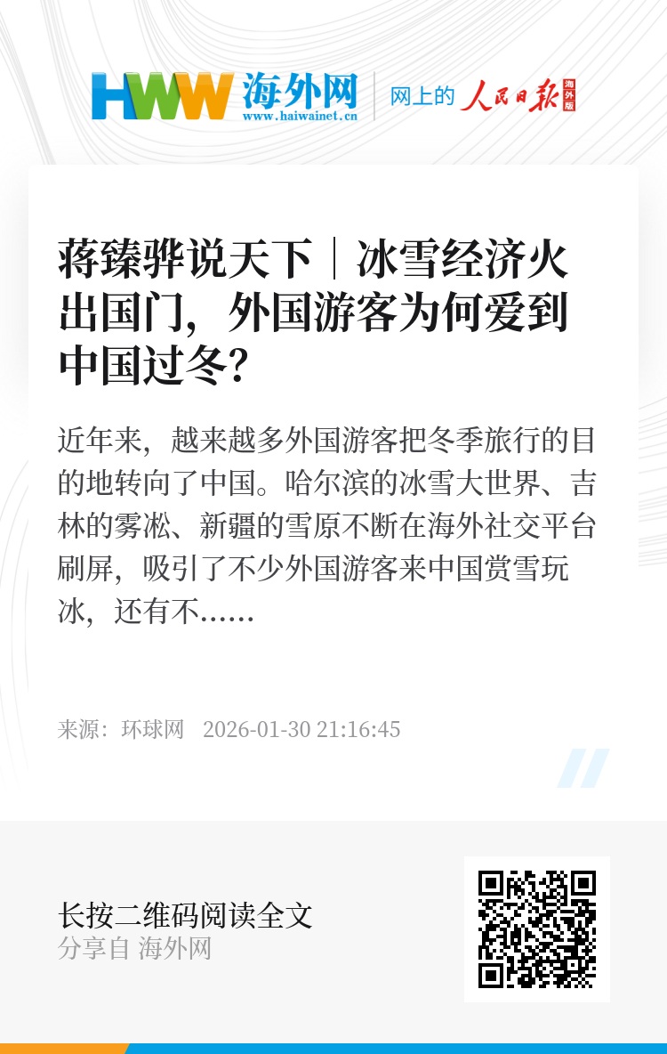 近年来,越来越多外国游客把冬季旅行的目的地转向了中国。哈尔滨的冰雪大世界、吉林的雾凇、新疆的雪原不断在海外社交平台刷屏,吸引了不少外国游客来中国赏雪玩冰,还有不少海外网友留言表达对中国冰雪旅游的向往,称赞中国正把“冷资源”变成能体验、能消费的“热产业”。滑雪、冰雕、温泉、冰雪演艺、特色民宿等一整条冰雪消费链正在不断完善,引得海外媒体频频点赞,海外游客“疯狂种草”。中国冰雪经济的底气与潜力到底有多强?来听蒋臻骅和大家聊一聊。