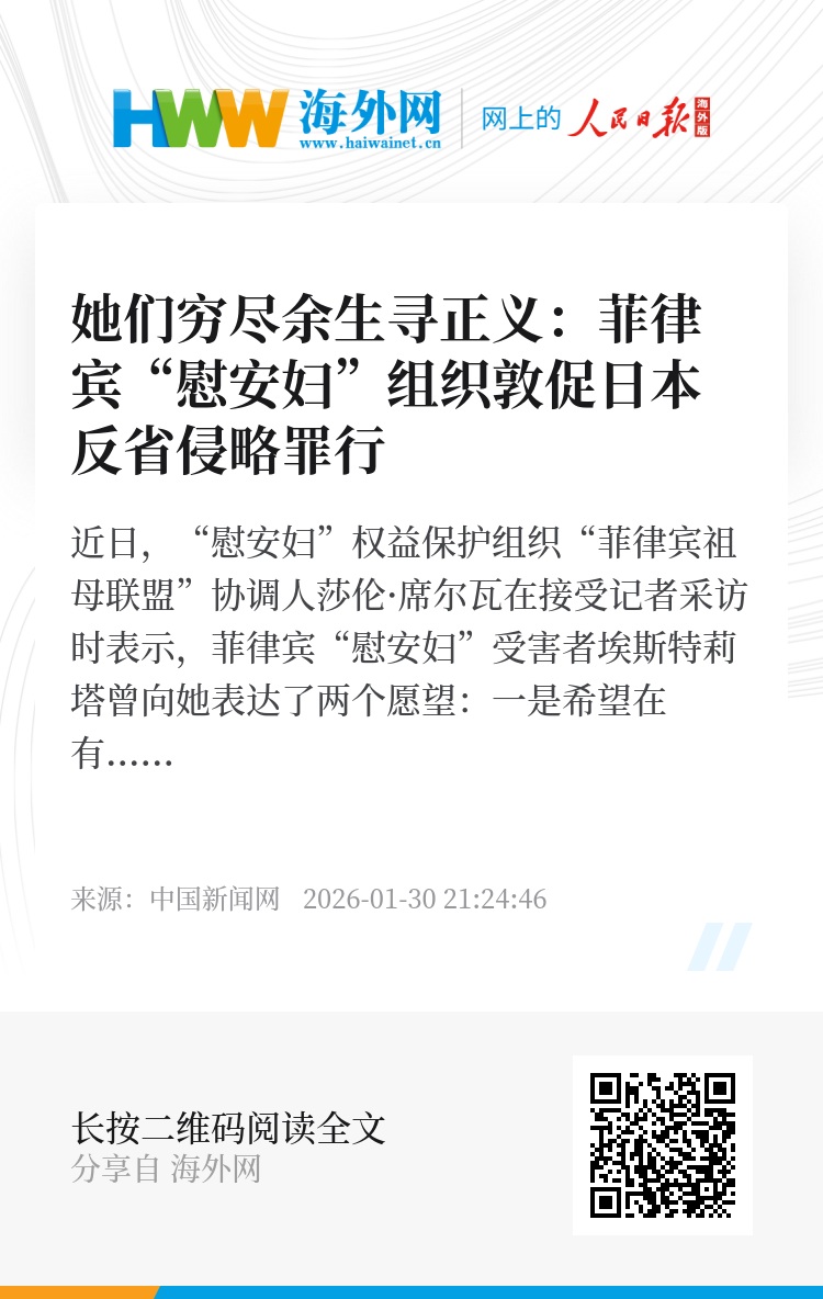 近日,“慰安妇”权益保护组织“菲律宾祖母联盟”协调人莎伦·席尔瓦在接受中新网记者采访时表示,菲律宾“慰安妇”受害者埃斯特莉塔曾向她表达了两个愿望:一是希望在有生之年能够看到正义伸张,二是年轻一代不会再经历她们在日军占领菲律宾时期所遭受的苦难。