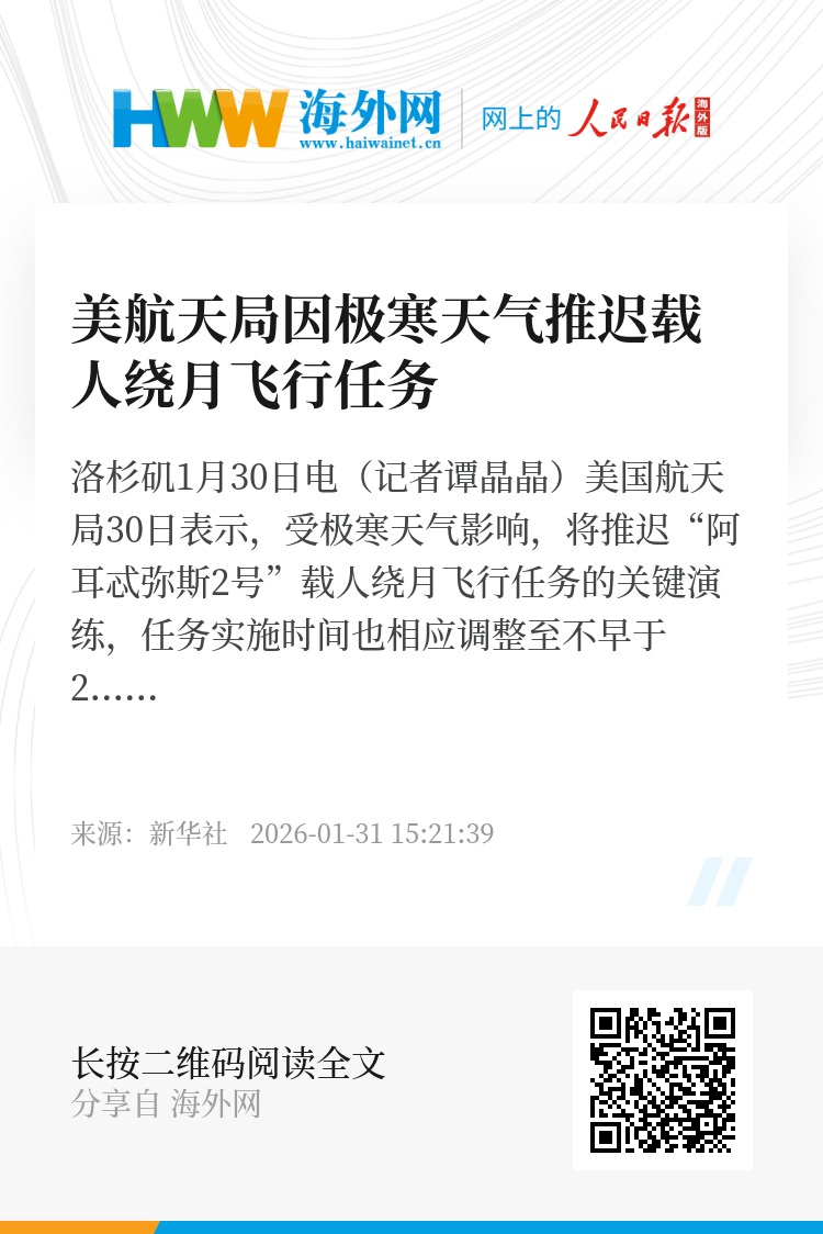 新华社洛杉矶1月30日电(记者谭晶晶)美国航天局30日表示,受极寒天气影响,将推迟“阿耳忒弥斯2号”载人绕月飞行任务的关键演练,任务实施时间也相应调整至不早于2月8日。
