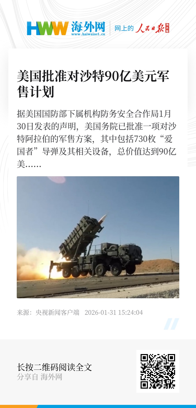 据美国国防部下属机构防务安全合作局1月30日发表的声明,美国务院已批准一项对沙特阿拉伯的军售方案,其中包括730枚“爱国者”导弹及其相关设备,总价值达到90亿美元。