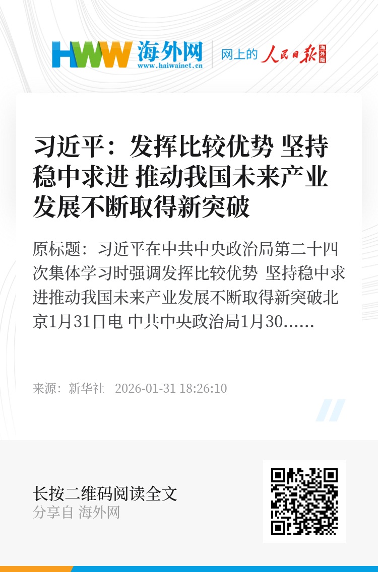 新华社北京1月31日电 中共中央政治局1月30日下午就前瞻布局和发展未来产业进行第二十四次集体学习。中共中央总书记习近平在主持学习时强调,新一轮科技革命和产业变革加速演进,前沿技术不断涌现,引领和支撑未来产业快速崛起。要站在推进强国建设、民族复兴伟业的战略高度,立足客观条件,发挥比较优势,坚持稳中求进、梯度培育,推动我国未来产业发展不断取得新突破。