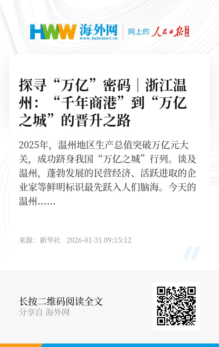 2025年,温州地区生产总值突破万亿元大关,成功跻身我国“万亿之城”行列。