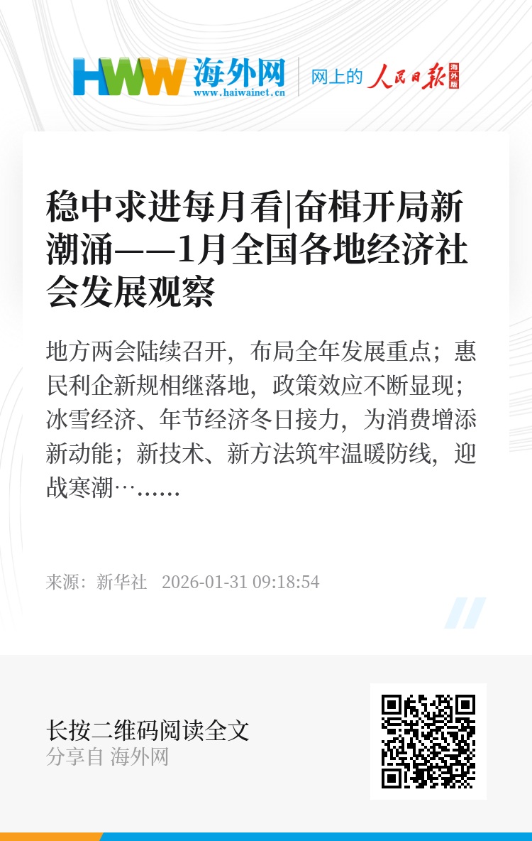 地方两会陆续召开,布局全年发展重点;惠民利企新规相继落地,政策效应不断显现;冰雪经济、年节经济冬日接力,为消费增添新动能;新技术、新方法筑牢温暖防线,迎战寒潮……1月以来,我国经济社会发展亮点多、新意足,在保持稳中有进态势下,全国各地奋楫开局,经济社会发展信心和动力不断增强。