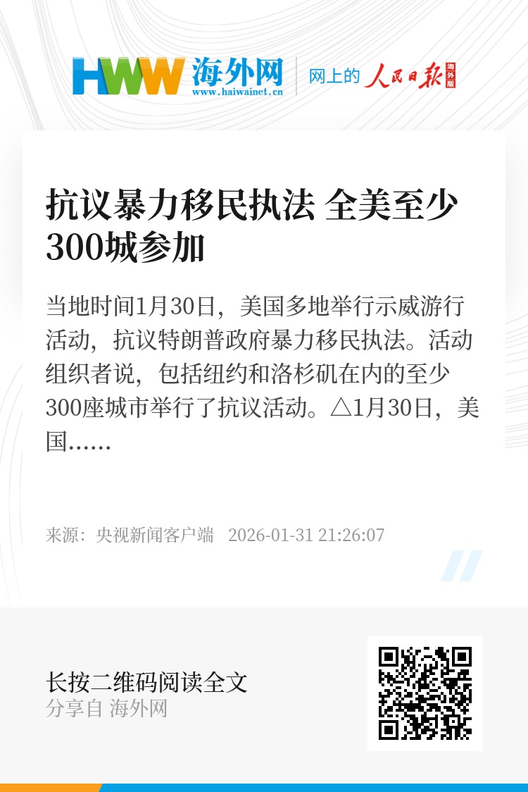 此前,美国反对特朗普政府暴力移民执法的抗议组织发布声明,呼吁民众参加30日举行的“全国停摆”活动,用“不上班、不上学、不购物”方式抗议特朗普政府暴力移民执法以及联邦执法人员在明尼阿波利斯市射杀两名美国公民古德和普雷蒂。