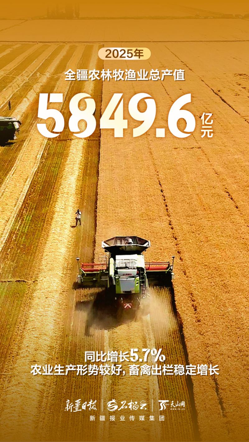 全疆农林牧渔业总产值5849.6亿元,同比增长5.7%,农业生产形势较好,畜禽出栏稳定增长。