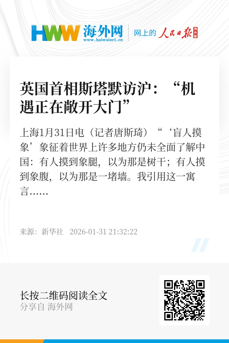 新华社上海1月31日电(记者唐斯琦)“‘盲人摸象’象征着世界上许多地方仍未全面了解中国:有人摸到象腿,以为那是树干;有人摸到象腹,以为那是一堵墙。我引用这一寓言,恰能说明此次访华的重要性。”1月31日,英国首相斯塔默在上海与中学生互动交流时这样回答。