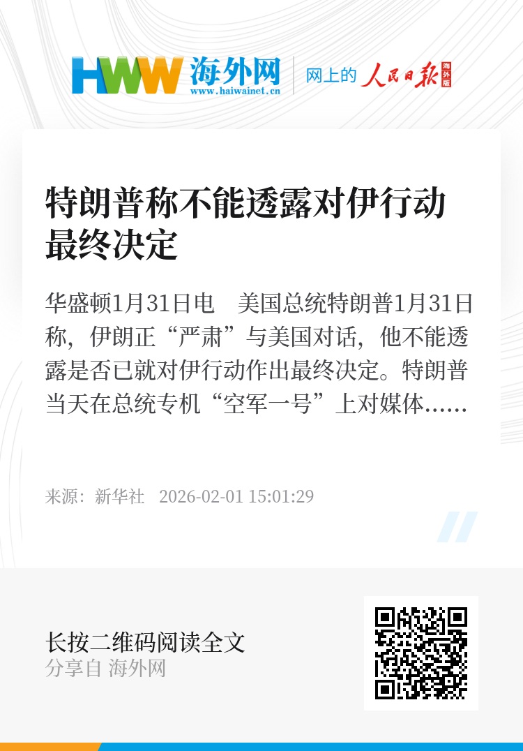 新华社华盛顿1月31日电 美国总统特朗普1月31日称,伊朗正“严肃”与美国对话,他不能透露是否已就对伊行动作出最终决定。