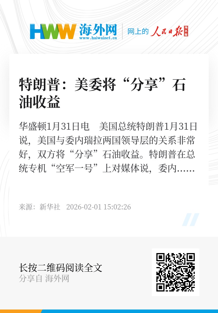 新华社华盛顿1月31日电 美国总统特朗普1月31日说,美国与委内瑞拉两国领导层的关系非常好,双方将“分享”石油收益。