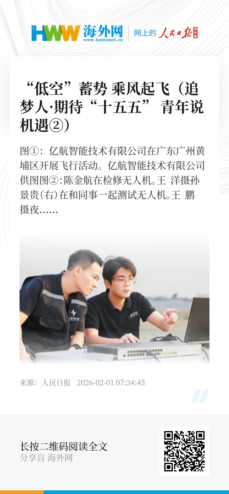 “十五五”规划建议提出,加快新能源、新材料、航空航天、低空经济等战略性新兴产业集群发展。新产业,新机遇,蓬勃发展的低空经济吸引了大量年轻人投入其中。近日,记者走近在低空经济赛道上奋斗成长的年轻人,听他们讲述“低空”蓄势、乘风而上的故事。