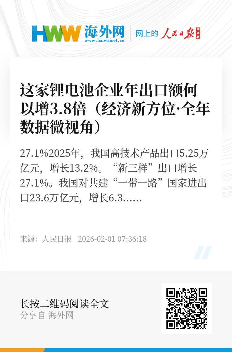 2025年,青海省出口增速达41.9%,锂电池占出口总值近半。作为一家锂电池企业,弗迪公司实现出口29.9亿元、同比增长3.8倍,产品销往匈牙利、乌兹别克斯坦、马来西亚、越南等共建“一带一路”国家和东盟市场。