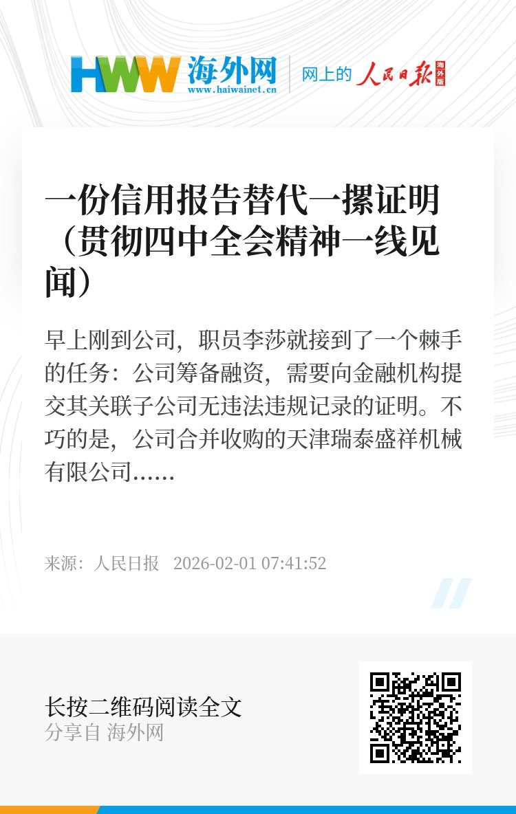 如今,“信用代证”的应用场景还在不断延伸:援外医疗项目中,个性化的信用证明能快速出具;招考录用、评优评先时,相关信用记录也能“一键调取”。从本地到跨地区,从便企到惠民,“信用代证3.0”改革正把“信用红利”送到更多人身边。