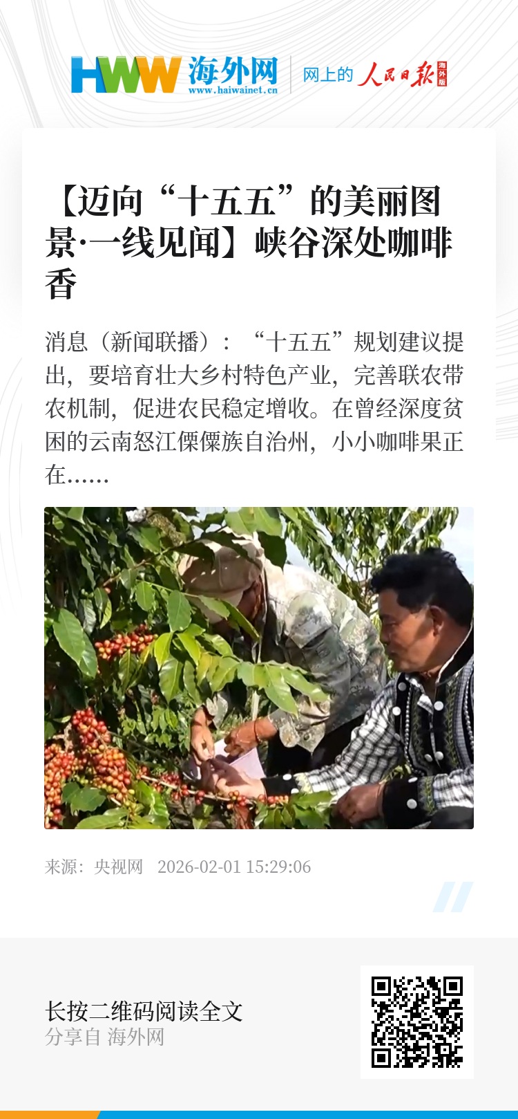 央视网消息(新闻联播):“十五五”规划建议提出,要培育壮大乡村特色产业,完善联农带农机制,促进农民稳定增收。在曾经深度贫困的云南怒江傈僳族自治州,小小咖啡果正在成为乡亲们的致富“大产业”。