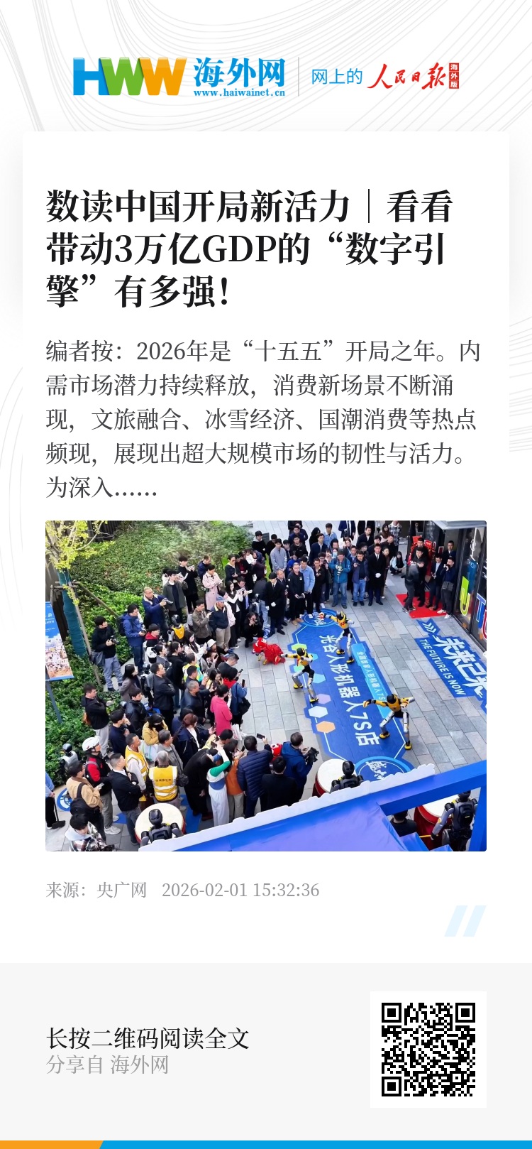 编者按:2026年是“十五五”开局之年。内需市场潜力持续释放,消费新场景不断涌现,文旅融合、冰雪经济、国潮消费等热点频现,展现出超大规模市场的韧性与活力。为深入解读开局新气象,央广网推出《数读中国开局新活力》系列报道,以数据为支撑,聚焦各地消费场景、产业升级与民生改善的生动实践,呈现中国经济稳中求进、活力迸发的时代图景。