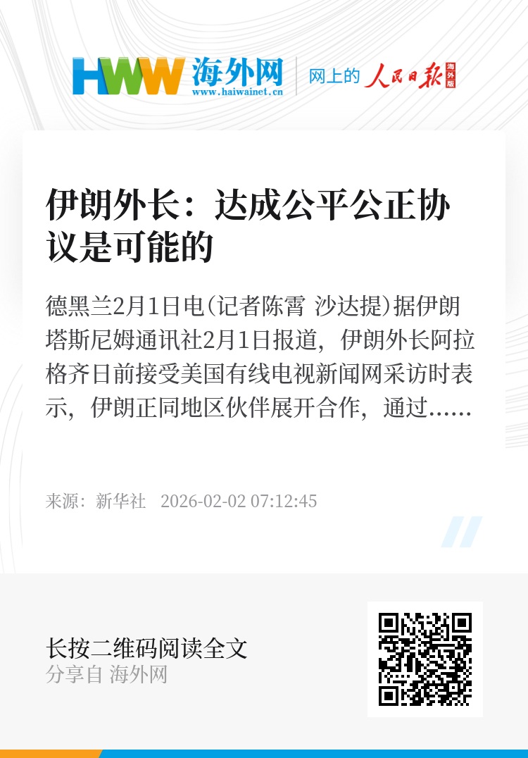 新华社德黑兰2月1日电(记者陈霄 沙达提)据伊朗塔斯尼姆通讯社2月1日报道,伊朗外长阿拉格齐日前接受美国有线电视新闻网采访时表示,伊朗正同地区伙伴展开合作,通过中间方与美国接触,目前取得一定成效。他强调伊朗不希望发生战争,并认为达成公平、公正的协议是可能的。