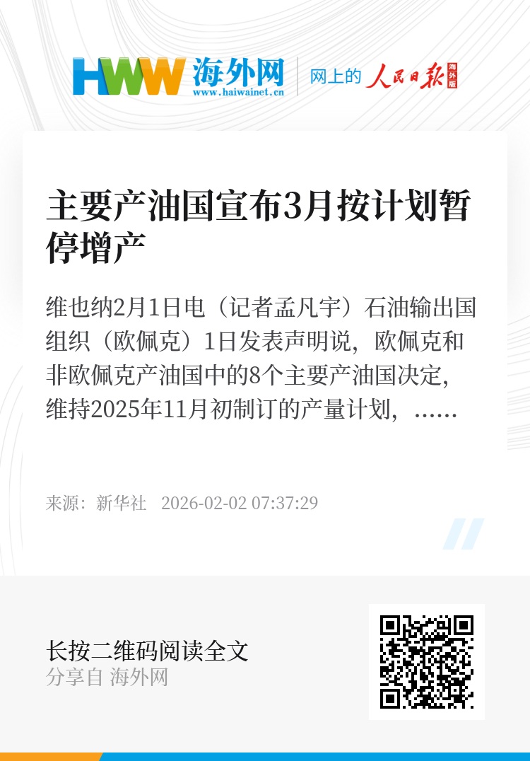 新华社维也纳2月1日电(记者孟凡宇)石油输出国组织(欧佩克)1日发表声明说,欧佩克和非欧佩克产油国中的8个主要产油国决定,维持2025年11月初制订的产量计划,在2026年3月继续暂停增产。