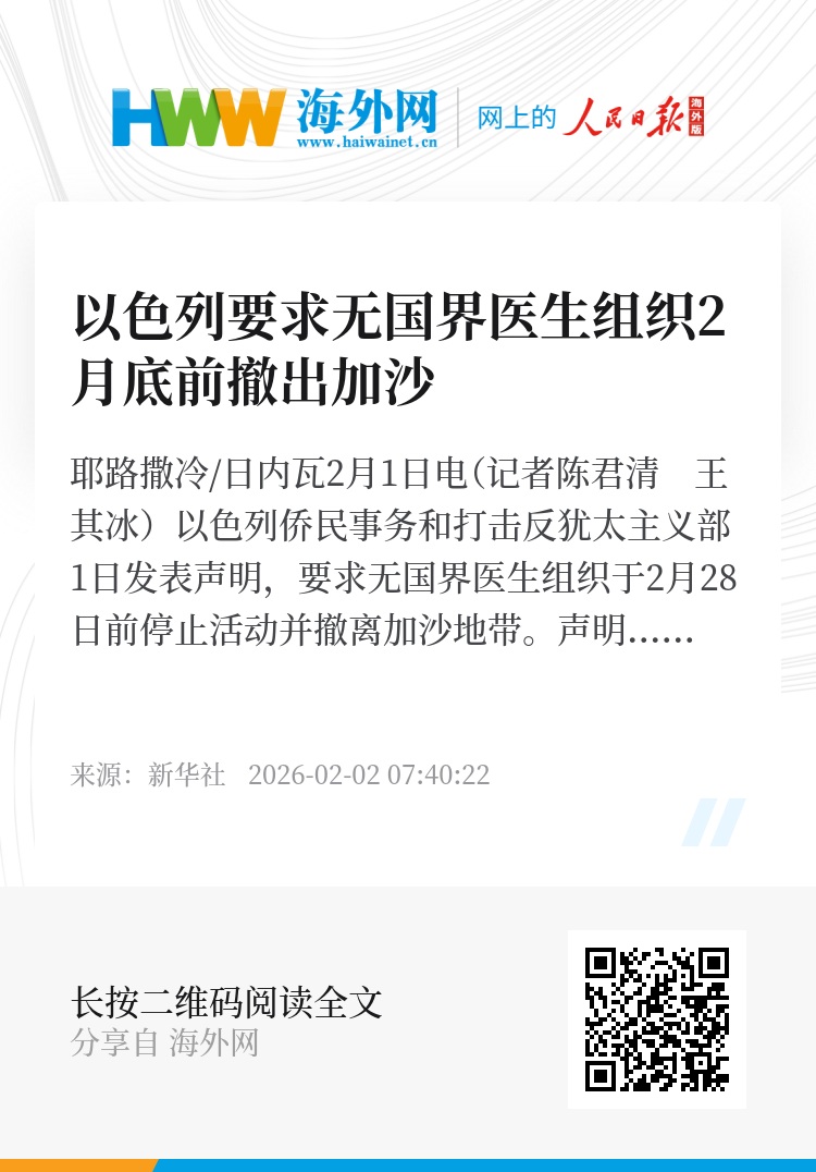 新华社耶路撒冷/日内瓦2月1日电(记者陈君清 王其冰)以色列侨民事务和打击反犹太主义部1日发表声明,要求无国界医生组织于2月28日前停止活动并撤离加沙地带。