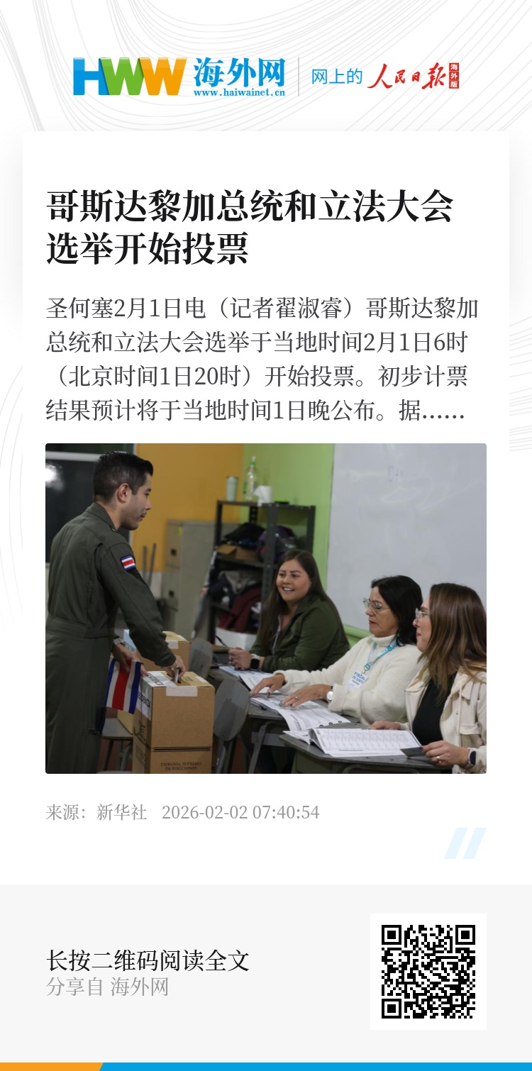 新华社圣何塞2月1日电(记者翟淑睿)哥斯达黎加总统和立法大会选举于当地时间2月1日6时(北京时间1日20时)开始投票。初步计票结果预计将于当地时间1日晚公布。