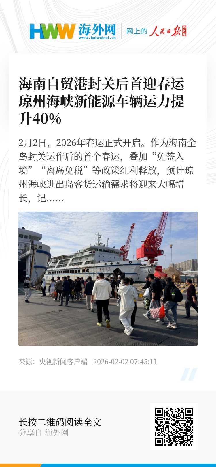 2月2日,2026年春运正式开启。作为海南全岛封关运作后的首个春运,叠加“免签入境”“离岛免税”等政策红利释放,预计琼州海峡进出岛客货运输需求将迎来大幅增长,记者从湛江海事局了解到,春运首日,“绿源六号”和“绿源九号”两艘新能源车辆专用运输船正式投用,助力琼州海峡新能源车过海运输保障能力提升40%,为春运高峰运输筑牢运力根基。