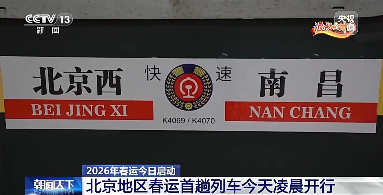 总台央视记者 陈晰:现在是零点四十分,由北京西开往南昌方向的K4069次列车正缓缓驶离站台,这是2026年北京地区始发的第一趟春运列车。