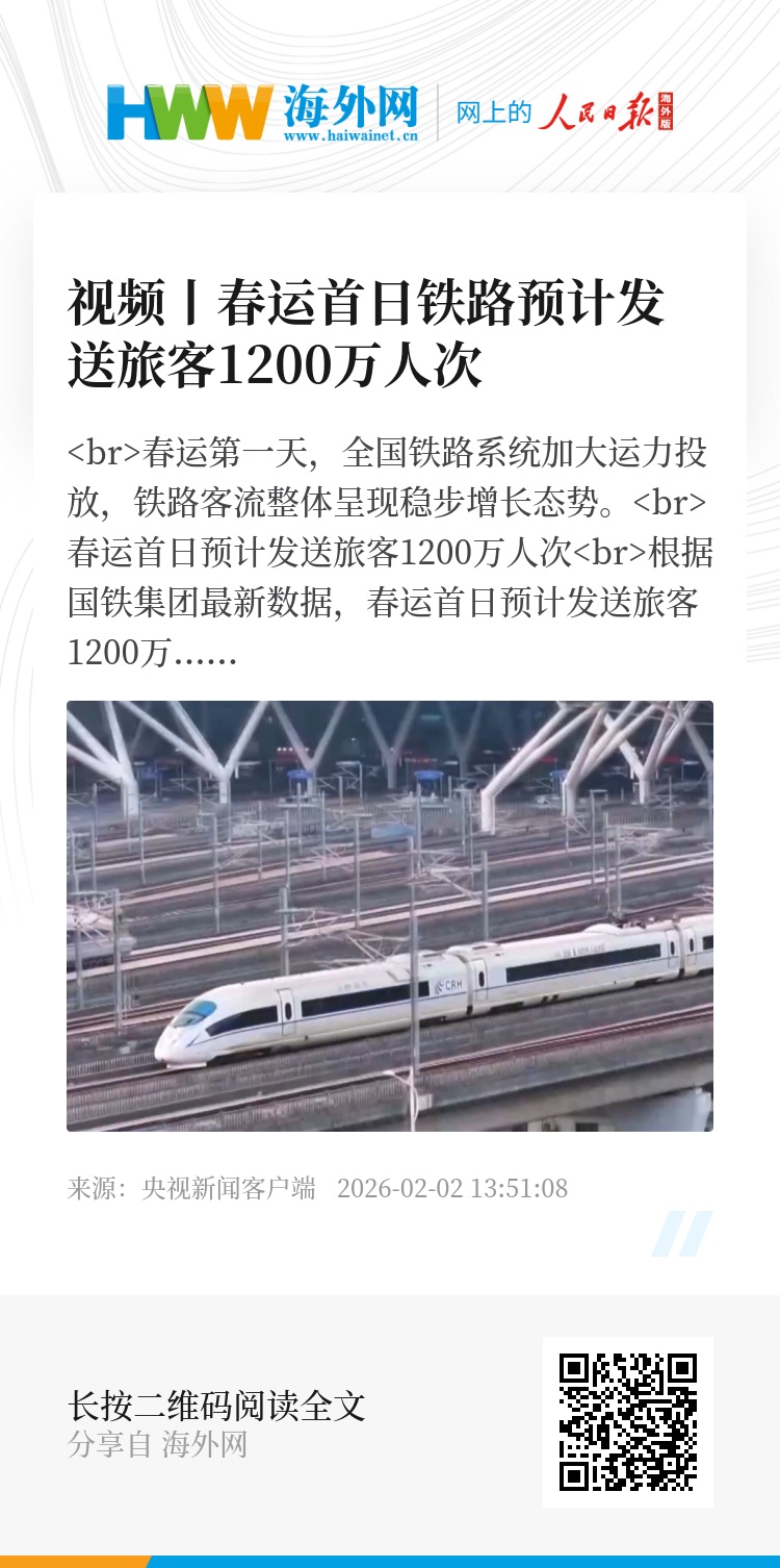 根据国铁集团最新数据,春运首日预计发送旅客1200万人次。2026年春运期间,也就是从今天开始,直到3月13日,全国铁路预计发送旅客5.4亿人次,日均发送1348万人次,同比增长5%。