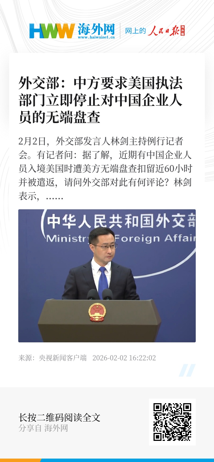 林剑表示,近期,美方执法部门多次对中国企业人员进行长时间无理盘查、扣押并遣返,执法手段粗暴,严重侵犯中国公民的正当合法权益,严重破坏两国正常的商务交流合作和人文交往氛围。中方对此强烈不满、坚决反对。中方敦促美方严肃认真对待中方关切,要求美国执法部门立即停止错误行径,停止对中国企业人员的无端盘查,切实落实两国元首重要共识,保障两国人民正常友好交流。中方将继续采取坚决有力措施,坚定维护中国公民的正当合法权益。
