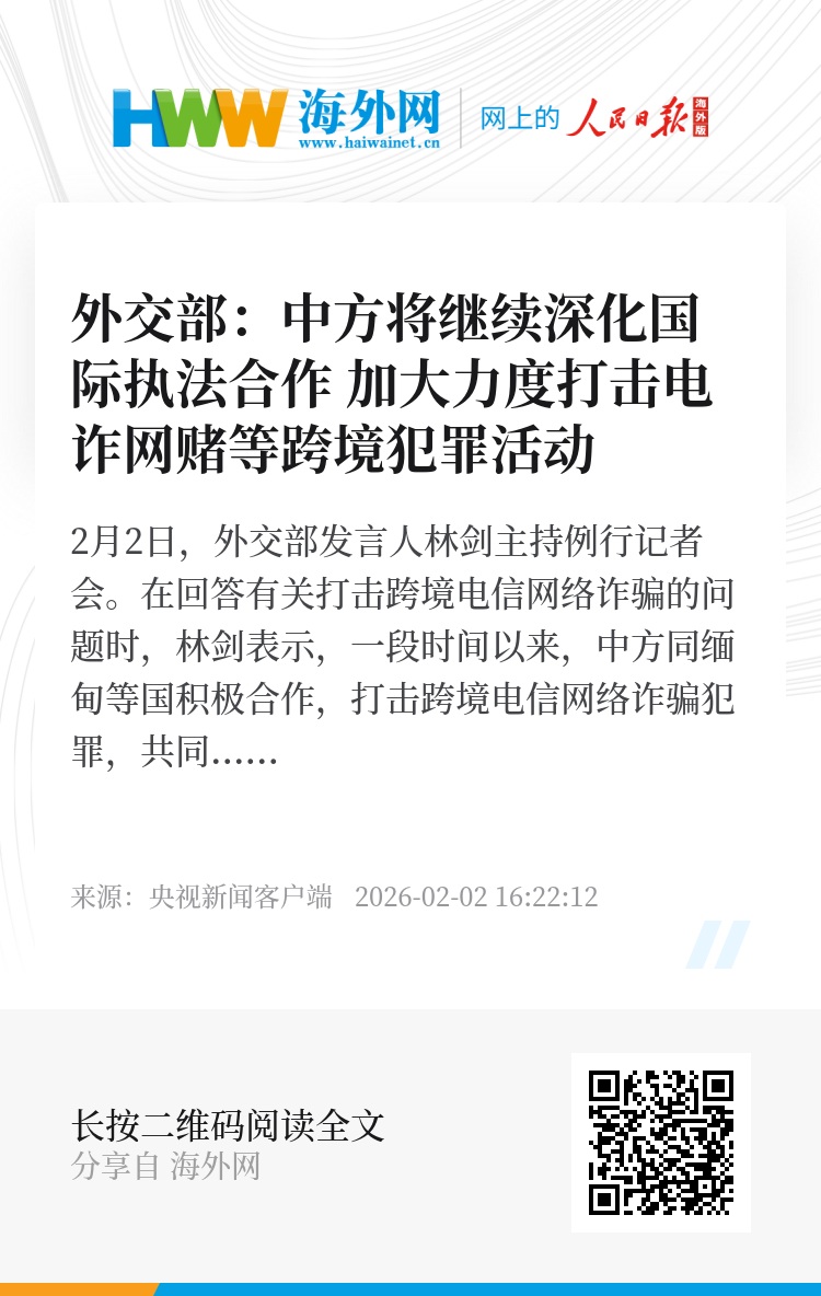 在回答有关打击跨境电信网络诈骗的问题时,林剑表示,一段时间以来,中方同缅甸等国积极合作,打击跨境电信网络诈骗犯罪,共同铲除网赌电诈的毒瘤,维护人民的生命财产安全和地区国家的交往合作秩序取得显著成效。中方将继续深化国际执法合作,加大力度打击电诈网赌及其他相关的跨境犯罪活动,共同铲除赌诈毒瘤。
