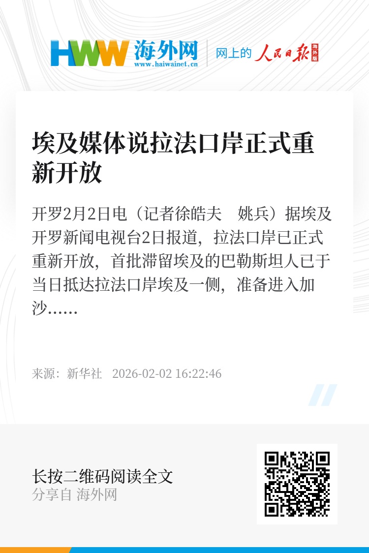 新华社开罗2月2日电(记者徐皓夫 姚兵)据埃及开罗新闻电视台2日报道,拉法口岸已正式重新开放,首批滞留埃及的巴勒斯坦人已于当日抵达拉法口岸埃及一侧,准备进入加沙地带。