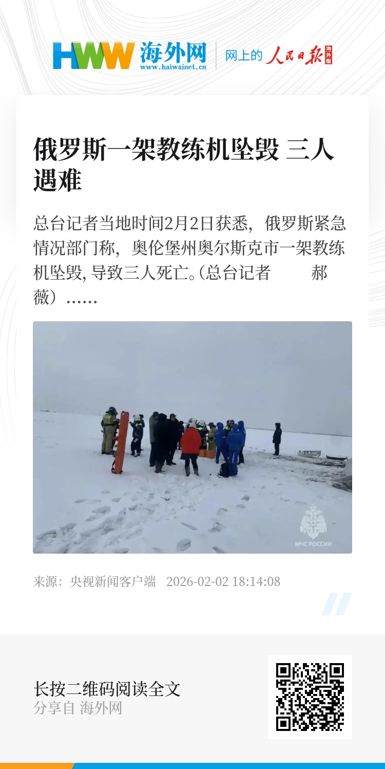 总台记者当地时间2月2日获悉,俄罗斯紧急情况部门称,奥伦堡州奥尔斯克市一架教练机坠毁,导致三人死亡。(总台记者 郝薇)