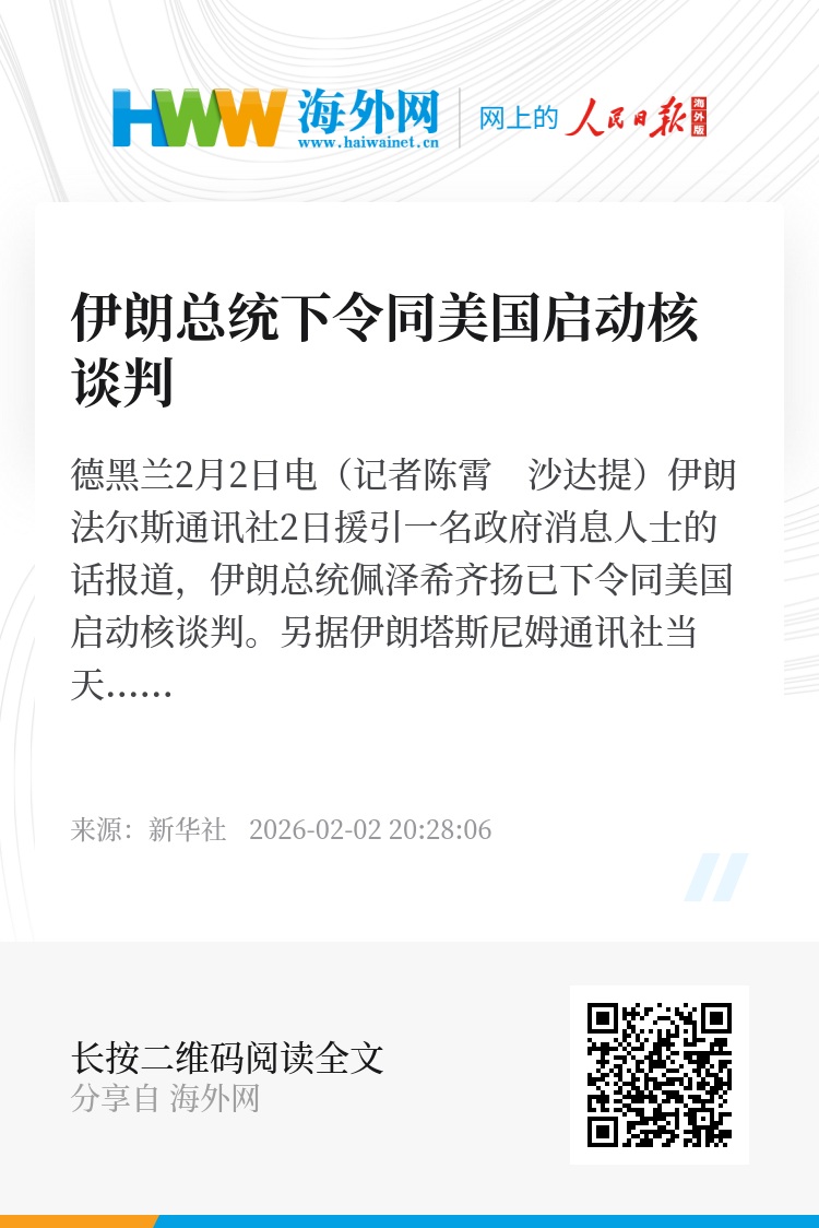 新华社德黑兰2月2日电(记者陈霄 沙达提)伊朗法尔斯通讯社2日援引一名政府消息人士的话报道,伊朗总统佩泽希齐扬已下令同美国启动核谈判。