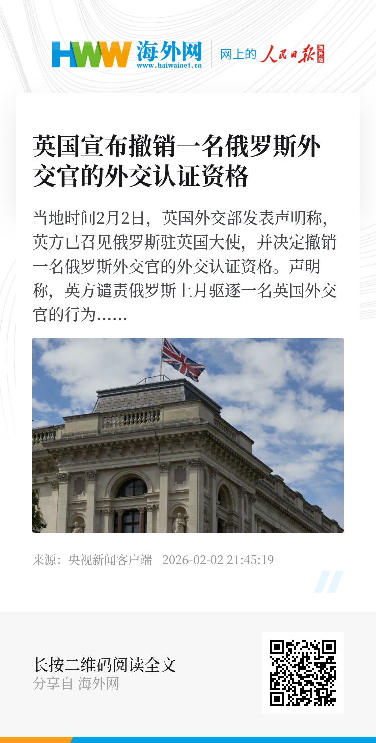 当地时间2月2日,英国外交部发表声明称,英方已召见俄罗斯驻英国大使,并决定撤销一名俄罗斯外交官的外交认证资格。