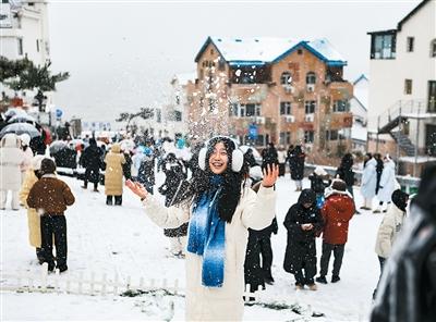 山东省威海市整合冰雪资源,推出美食、体育、旅游等各类活动,不断增强“冬游威海”魅力。图为1月中旬,威海迎来降雪,各地游客前来赏雪、拍照。
