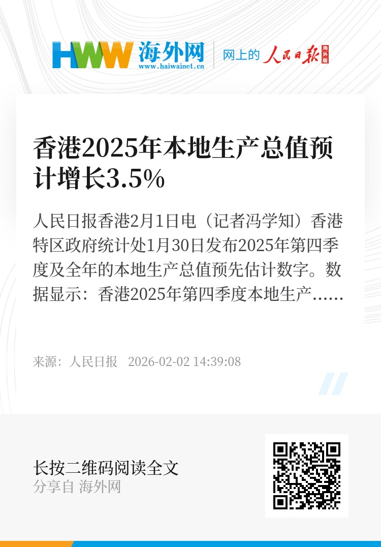 人民日报香港2月1日电(记者冯学知)香港特区政府统计处1月30日发布2025年第四季度及全年的本地生产总值预先估计数字。数据显示:香港2025年第四季度本地生产总值较上年同期预计实质增长3.8%,全年本地生产总值预计实质同比增长3.5%。