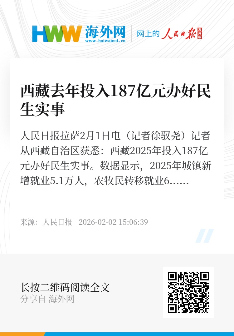 人民日报拉萨2月1日电(记者徐驭尧)记者从西藏自治区获悉:西藏2025年投入187亿元办好民生实事。数据显示,2025年城镇新增就业5.1万人,农牧民转移就业66万人,实现劳务收入75.4亿元。西藏覆盖全民的多层次社会保障体系基本建成。