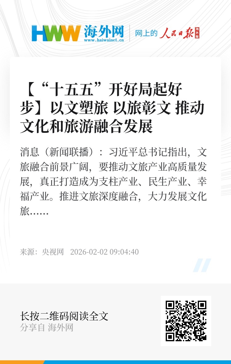 央视网消息(新闻联播):习近平总书记指出,文旅融合前景广阔,要推动文旅产业高质量发展,真正打造成为支柱产业、民生产业、幸福产业。推进文旅深度融合,大力发展文化旅游业,以文化赋能经济社会发展,“十五五”开局之年,各地区各有关部门强化政策支持、整合文旅资源、推进业态融合,推动我国文化旅游业加快发展。