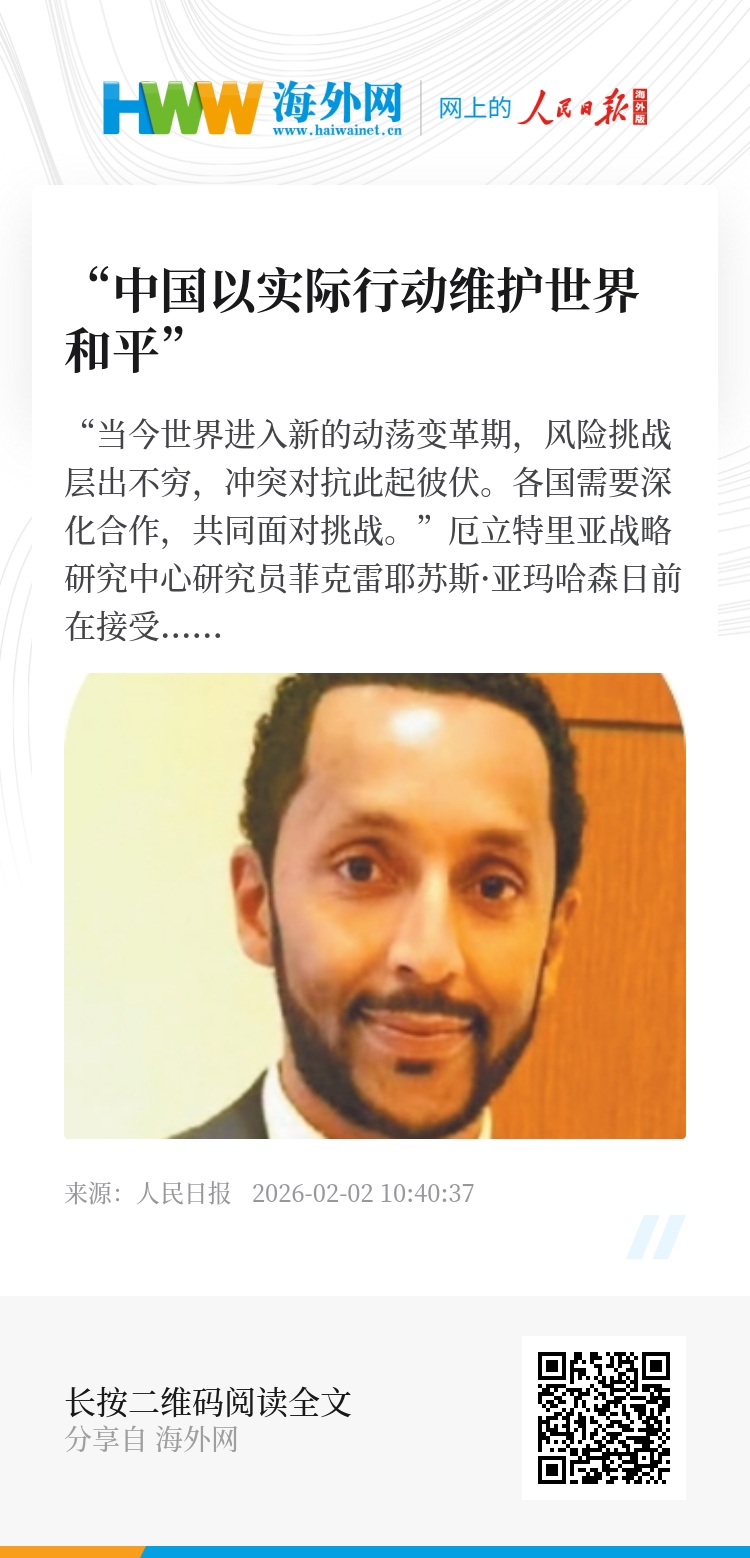 菲克雷耶苏斯表示,厄立特里亚与中国传统友谊深厚,合作历史悠久。两国深厚的友谊建立在平等、相互尊重主权和独立的基础上。厄中合作前景广阔,特别是在厄立特里亚加入共建“一带一路”大家庭、厄中关系提升为战略伙伴关系之后,两国合作不仅将推动双边关系发展,还将进一步促进地区和全球的和平与稳定,为动荡的时代注入更多稳定性。(记者 沈小晓)