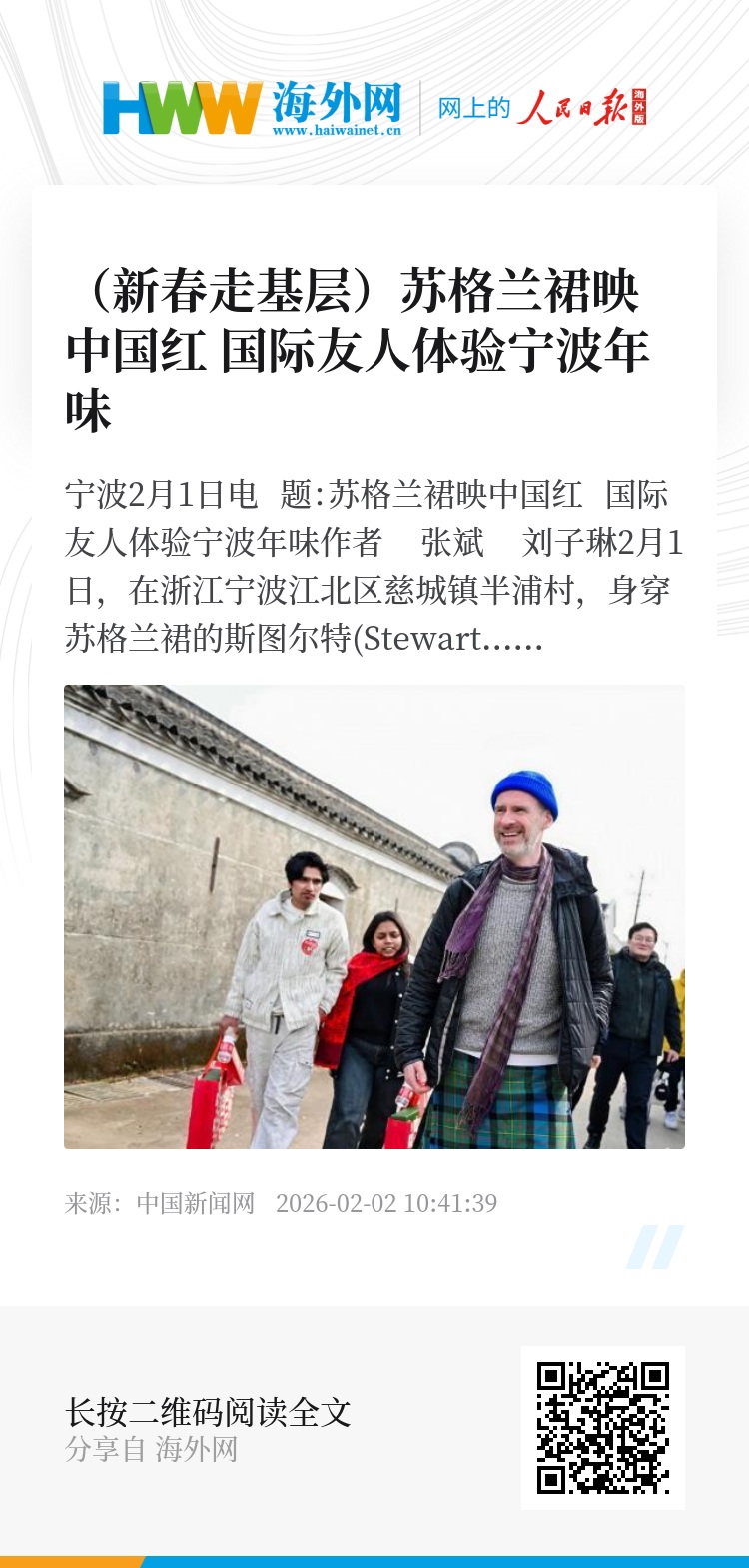 中新网宁波2月1日电 题:苏格兰裙映中国红 国际友人体验宁波年味