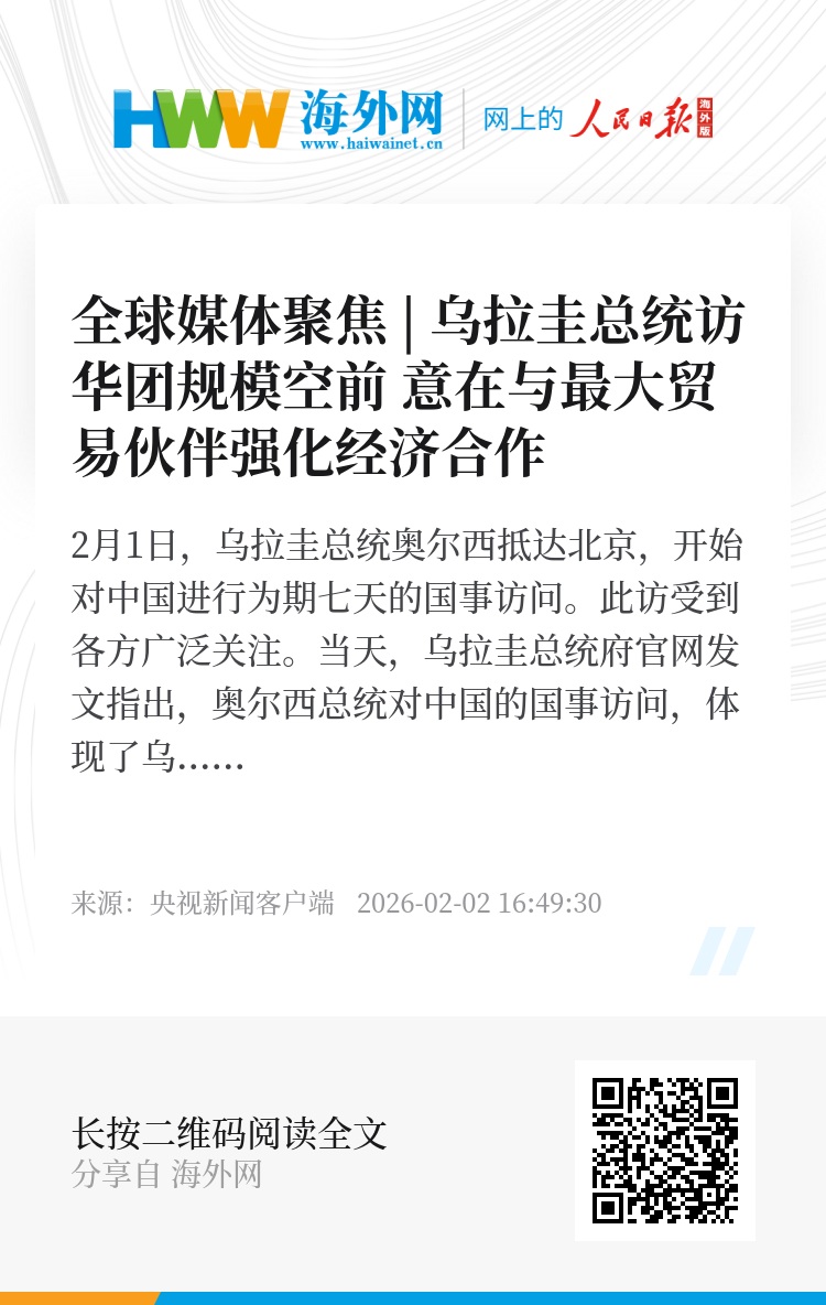 报道还说,这是乌拉圭迄今为止规模最大的官方出访团,旨在进一步深化乌中双边关系。据乌官方透露,此次访问将签署多份合作协议,重点将是技术与创新领域的合作。