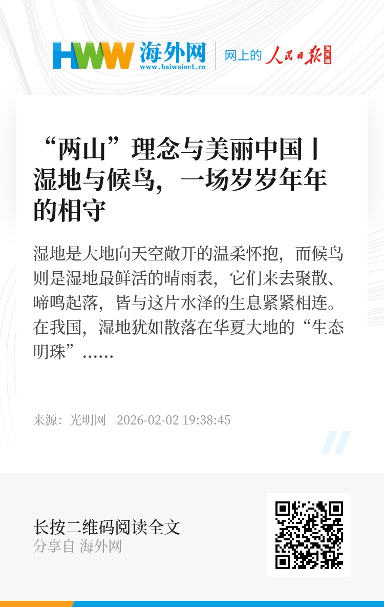 从《湿地保护法》的坚实护航,到千万生态管护员的日夜坚守;从卫星监测的科技赋能,到湿地修复工程的遍地开花,我国用行动守护着5635万公顷湿地。如今,候鸟把远方的故事捎给湿地,湿地把四季的温柔赠予候鸟。一方湿地,便是人与自然和谐共生的鲜活佐证。