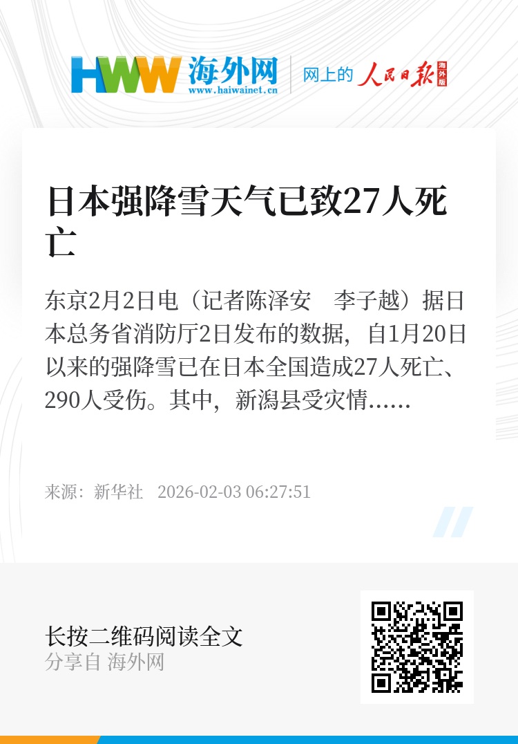新华社东京2月2日电(记者陈泽安 李子越)据日本总务省消防厅2日发布的数据,自1月20日以来的强降雪已在日本全国造成27人死亡、290人受伤。