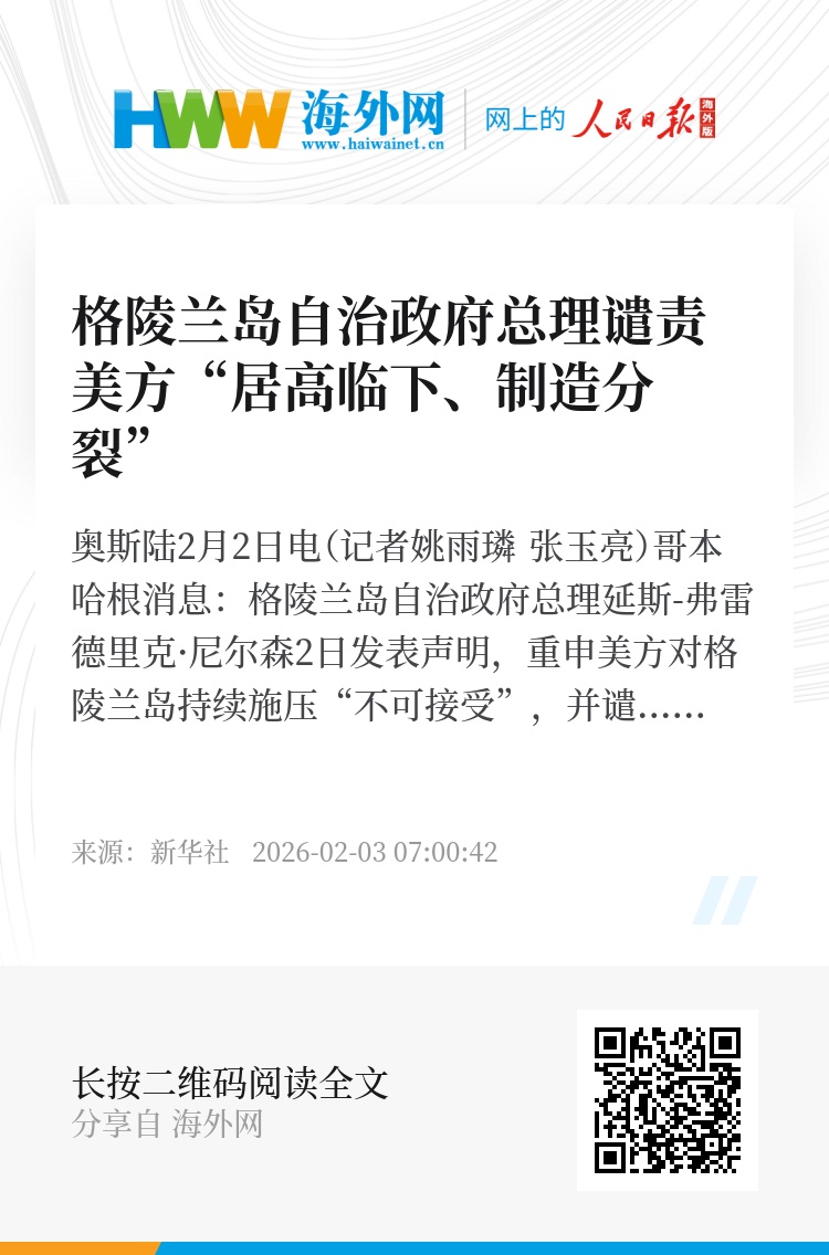 新华社奥斯陆2月2日电(记者姚雨璘 张玉亮)哥本哈根消息:格陵兰岛自治政府总理延斯-弗雷德里克·尼尔森2日发表声明,重申美方对格陵兰岛持续施压“不可接受”,并谴责美方“居高临下、制造分裂”。