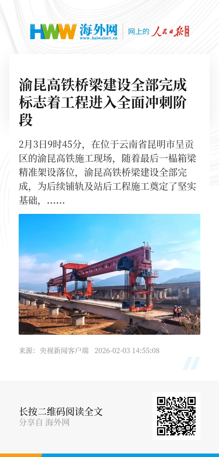 2月3日9时45分,在位于云南省昆明市呈贡区的渝昆高铁施工现场,随着最后一榀箱梁精准架设落位,渝昆高铁桥梁建设全部完成,为后续铺轨及站后工程施工奠定了坚实基础,标志着渝昆高铁建设进入全面冲刺阶段。