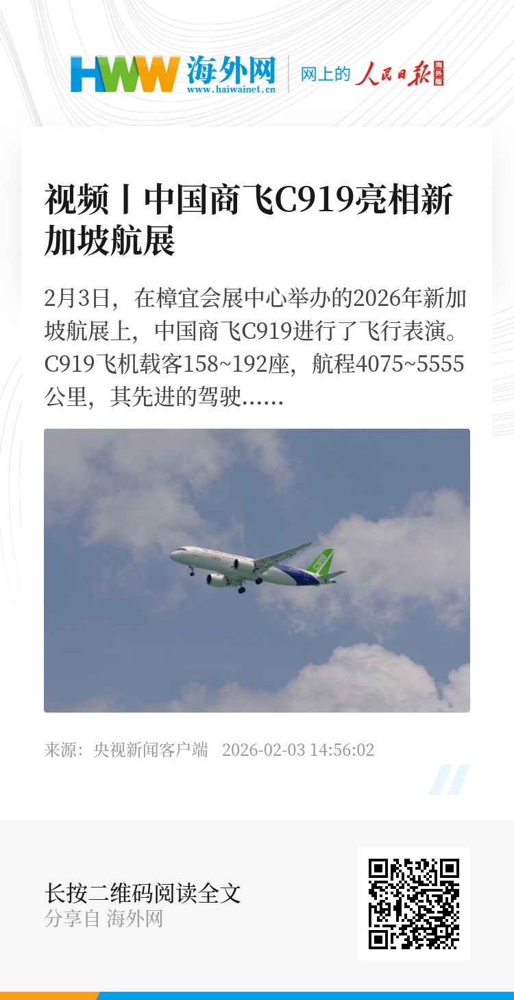 2月3日,在樟宜会展中心举办的2026年新加坡航展上,中国商飞C919进行了飞行表演。