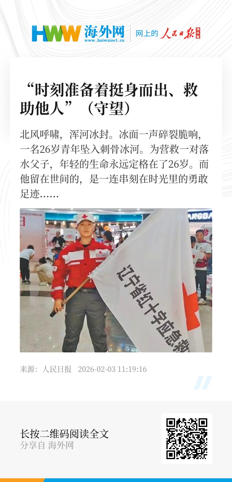 北风呼啸,浑河冰封。冰面一声碎裂脆响,一名26岁青年坠入刺骨冰河。为营救一对落水父子,年轻的生命永远定格在了26岁。而他留在世间的,是一连串刻在时光里的勇敢足迹:在校期间参军入伍、加入省红十字救援队、10多次无偿献血、多次街头急救……点滴善行,皆源于日记中那句“无名无利无悔,有情有义有祖国”的坚定信念。他用一次次实际行动,诠释着新时代青年的家国情怀。
