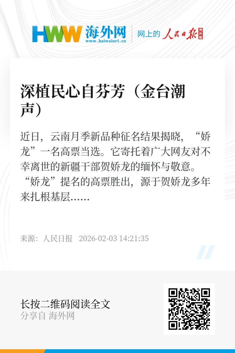 近日,云南月季新品种征名结果揭晓,“娇龙”一名高票当选。它寄托着广大网友对不幸离世的新疆干部贺娇龙的缅怀与敬意。
