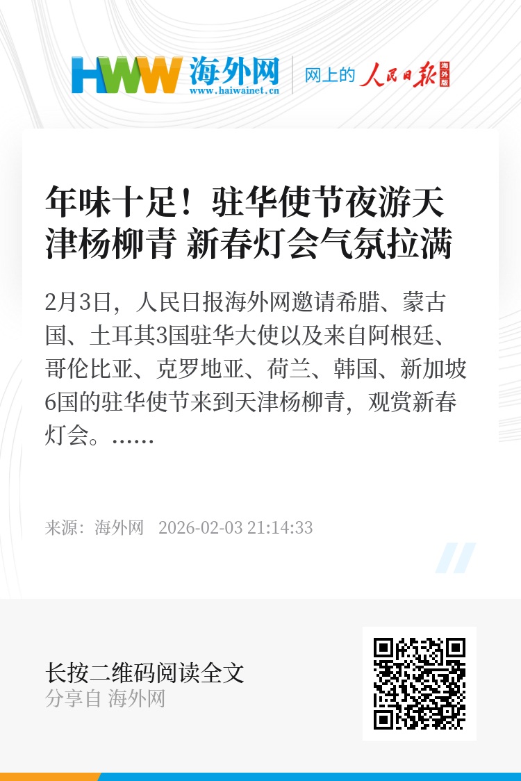 2月3日,人民日报海外网邀请希腊、蒙古国、土耳其3国驻华大使以及来自阿根廷、哥伦比亚、克罗地亚、荷兰、韩国、新加坡6国的驻华使节来到天津杨柳青,观赏新春灯会。现场气氛拉满,年味十足。