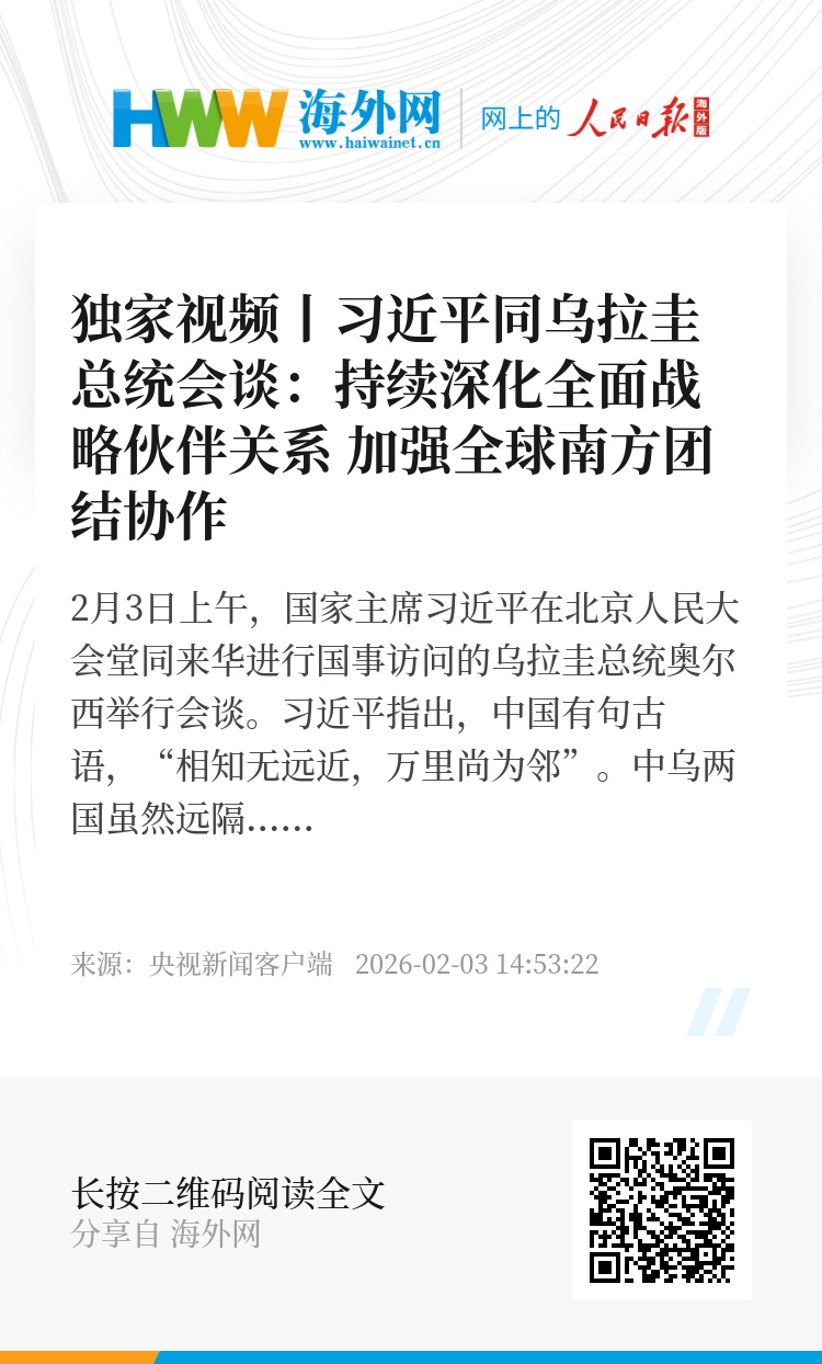 习近平指出,中国有句古语,“相知无远近,万里尚为邻”。中乌两国虽然远隔重洋,但双方理念相近、友谊深厚,是隔海相望的好邻居、好伙伴。面对当前变乱交织的国际形势,中乌两国要持续深化全面战略伙伴关系,加强全球南方团结协作,携手推进平等有序的世界多极化、普惠包容的经济全球化,为推动构建人类命运共同体作出更大贡献。