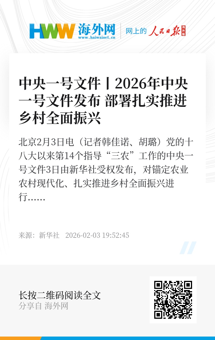 新华社北京2月3日电(记者韩佳诺、胡璐)党的十八大以来第14个指导“三农”工作的中央一号文件3日由新华社受权发布,对锚定农业农村现代化、扎实推进乡村全面振兴进行了部署。