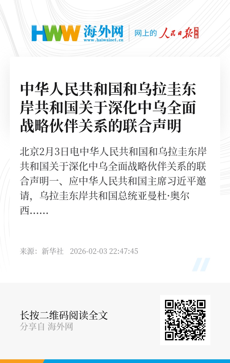一、应中华人民共和国主席习近平邀请,乌拉圭东岸共和国总统亚曼杜·奥尔西于2026年2月1日至7日对中国进行国事访问。