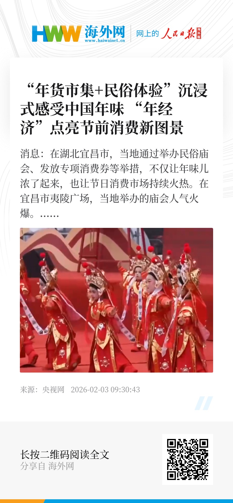 央视网消息:在湖北宜昌市,当地通过举办民俗庙会、发放专项消费券等举措,不仅让年味儿浓了起来,也让节日消费市场持续火热。